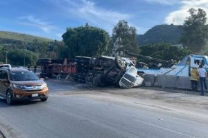 Durante la madrugada de hoy, un tráiler de doble semi remolque, cargado con ropa y textiles volcó en la Avenida Jesús Reyes Heroles...