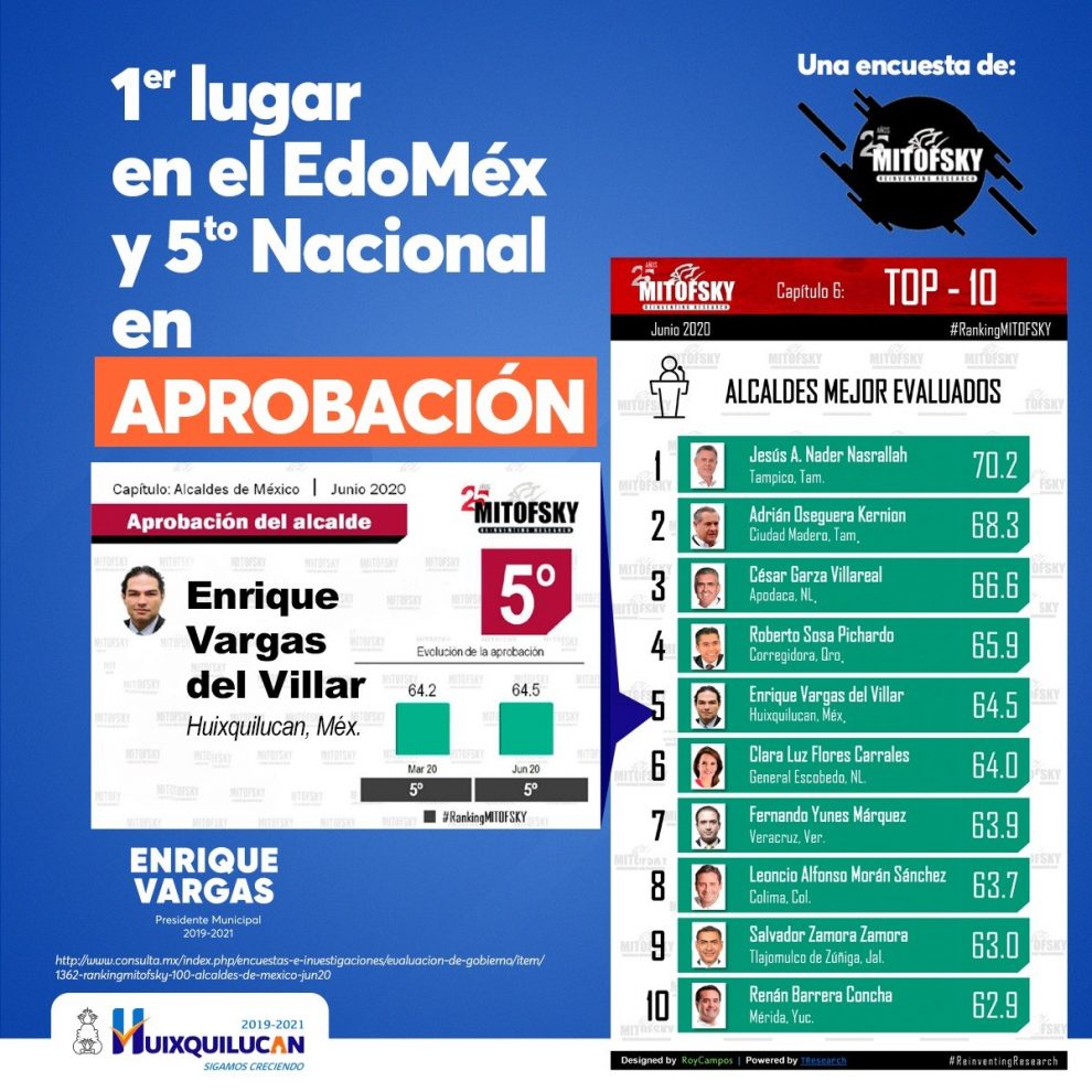 Los meses pasan en el país, pandemias vienen y van, pero Enrique Vargas, Presidente Municipal de Huixquilucan, se mantiene como el número 1 de la lista como mejor alcalde en la entidad, según el último estudio realizado por Consultas Mitofsky, a la lista se suman alcaldes de otros estados como Renán Barrera de Mérida o Roberto Sosa Pichardo de Queretaro.