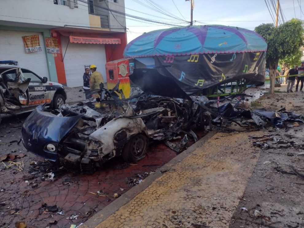 Después de que explotaron todos los fuegos artificiales la patrulla quedó destrozada en la vialidad por donde transitaba.